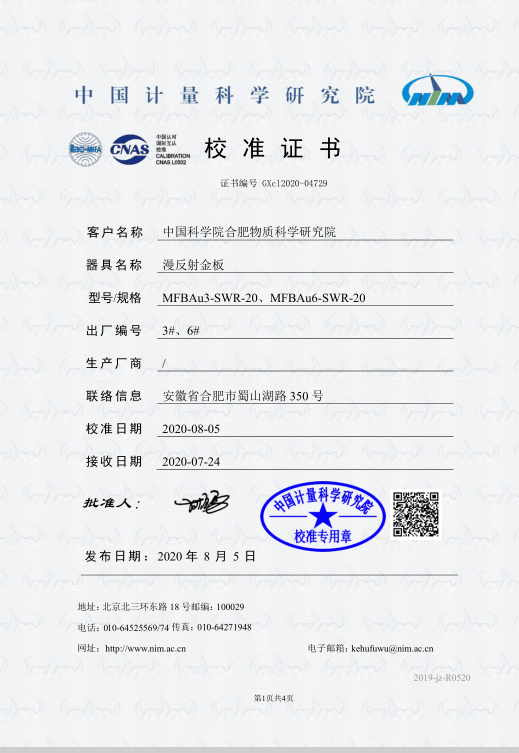 本公司受托為中科院研制金板 經(jīng)中國(guó)計(jì)量科學(xué)研究院校準(zhǔn)